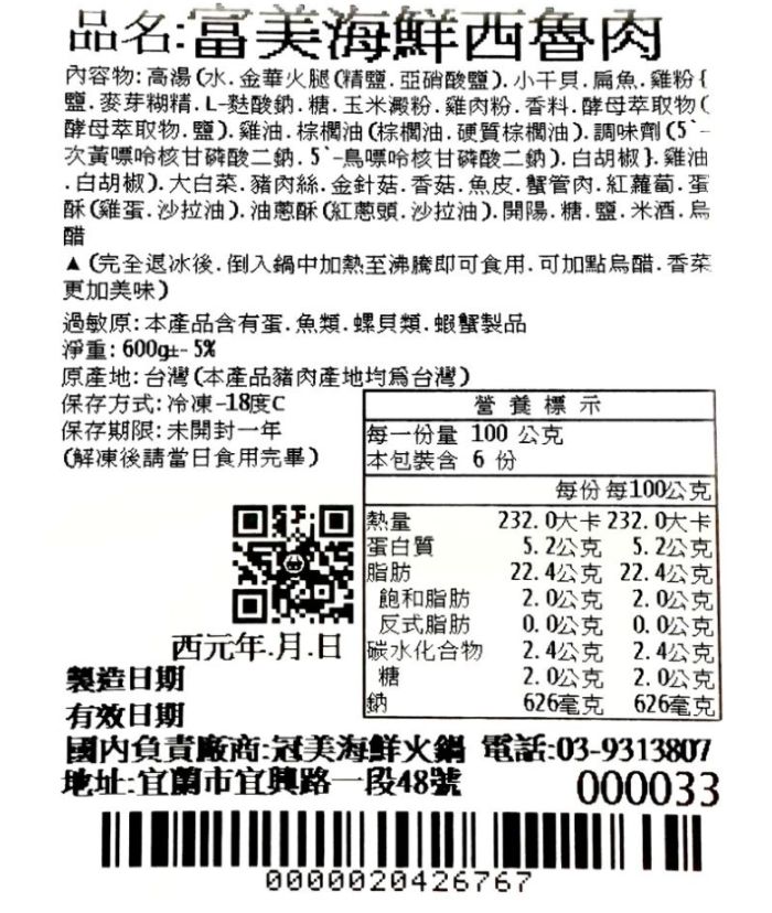 | 製造商/國內負責廠商名稱 | 冠美海鮮火鍋 |