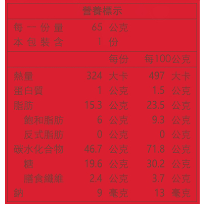 | 營養標示 | 每一份量65公克,本包裝含1份。蛋白質1公克、脂肪15.3公克、飽和脂肪6公克、反式脂肪0公克、碳水化合物46.7公克、糖19.6公克、膳食纖維2.4公克、鈉9毫克。 |