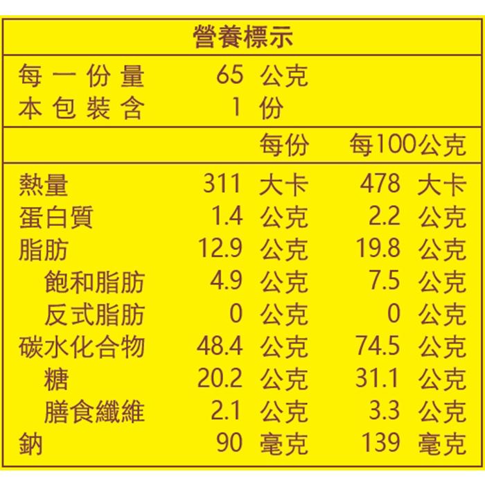 | 營養標示 | 每一份量65公克,本包裝含1份。蛋白質1.4公克、脂肪12.9公克、飽和脂肪4.9公克、反式脂肪0公克、碳水化合物48.4公克、糖20.2公克、膳食纖維2.1公克、鈉90毫克。 |