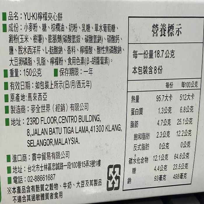 | 內容物(完整成份/食品添加物) | 小麥粉、糖、棕櫚油、奶粉、乳糖、單水葡萄糖、 澱粉(玉米、樹薯)、膨脹劑(碳酸氫銨、碳酸氫鈉)、碳酸鈣、 鹽、脫水西洋芹、L-麩酸鈉、香料、檸檬酸、酸性焦磷酸鈉、 大豆卵磷脂、乳脂、檸檬粉、食用色素(B-胡蘿蔔素)。 |