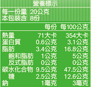 | 過敏原資訊 | 本產品含有芝麻。本產品之製造工廠生產含有麩質的穀類、甲殼類、蛋類、魚類、花生、大豆、奶類、堅果製品、芒果、芹菜與軟體動物類的產品於同一工廠生產,食物過敏者請留意。 |