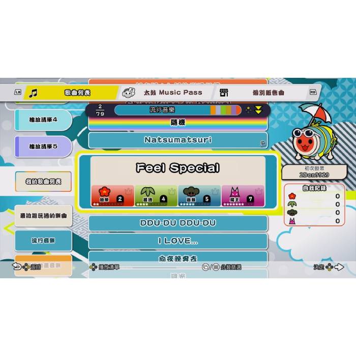 收錄模式 【演奏遊戲】 選擇喜歡的樂曲,跟著節奏演奏和太鼓,以通關為目標吧! 難度總共有4種。 遊戲中收錄了各種類型的樂曲,像是「紅蓮華」、「隔壁的龍貓」等卡通動畫音樂,「查爾斯」等VOCALOID™ Music,「MEGALOVANIA」等遊戲音樂,「向夜晚奔去」、「Feel Special」等流行音樂共76首! 可由最多2人一起演奏,或是進行成績對決。 還有「進步支援」可以反覆練習、提升實力!