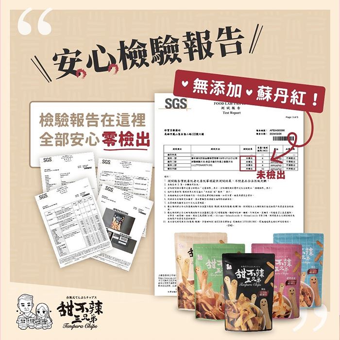 | 注意事項 | 本品含有魚類及大豆製品,不適合對其過敏體質者食用。 包装内含脫氧劑及乾燥劑,請勿食用。本產品因使用新鮮魚漿製成的甜不辣,故每批餅乾颜色有深有淺,含油量不盛相同,每片甜不辣三兄弟餅乾,純手工切製,原薄应不均,屬正第現象,請安心食用。 本公司已投保產品贵任險2000萬元,請安心食用。 |