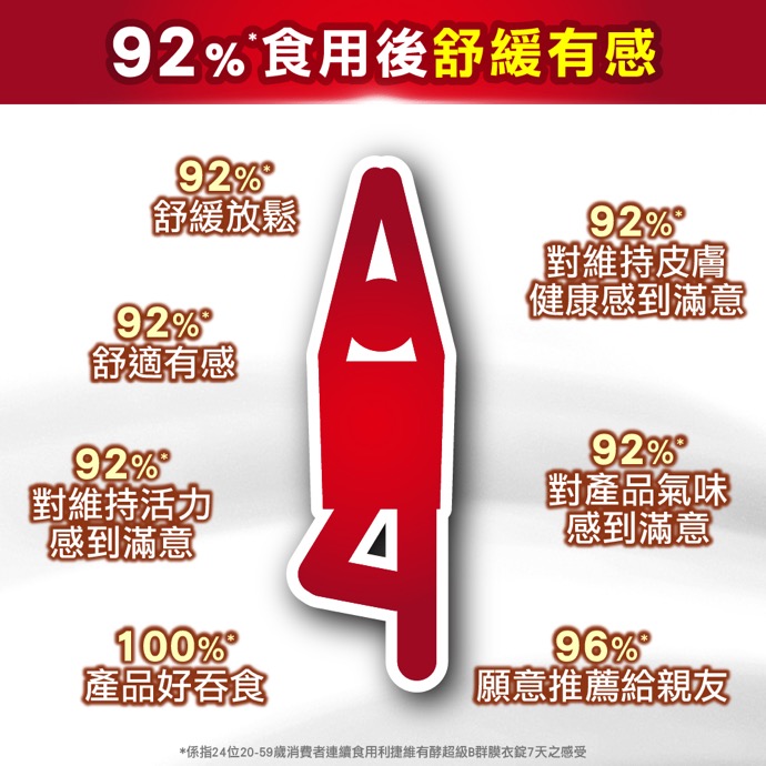 | 內容物 (完整成份/食品添加物) | 維生素B6、維生素B1、維生素B2、鹽酸呋喃硫胺、牛磺酸、膜衣成分(聚乙烯醇、滑石粉、羥丙基甲基纖維素、二氧化鈦、喹啉黃鋁麗基、聚乙二醇、食用黃色五號鋁麗基、食用藍色二號鋁麗基)、維生素C(維生素C、玉米澱粉)、羥丙基纖維素、羥丙基甲基纖維素、硬脂酸鎂、二氧化矽、超亮光水性膜衣(羧甲基纖維素鈉、麥芽糊精、葡萄糖、大豆卵磷脂、檸檬酸鈉)、維生素B12、食用紅色四十號。 |
