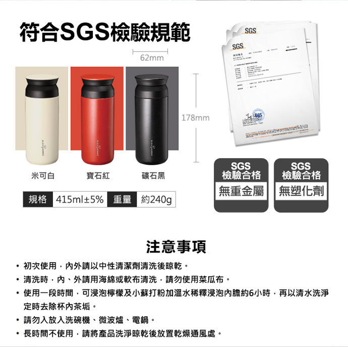 | 包裝內容/商品規格 | 滿水容量約 415ml ± 5% 有效容量約 370ml ± 5% 淨 重(g) 約 240g ± 5%(單一個) 商品尺寸:底徑6.2 / H17.8 / 口徑5.5cm |