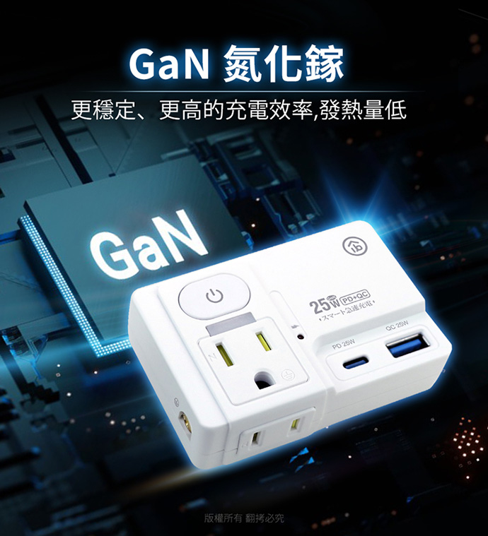 .商品名稱:aibo GaN氮化鎵 平壓式1開2插 高溫斷電智慧 PD25W快充 USB壁插