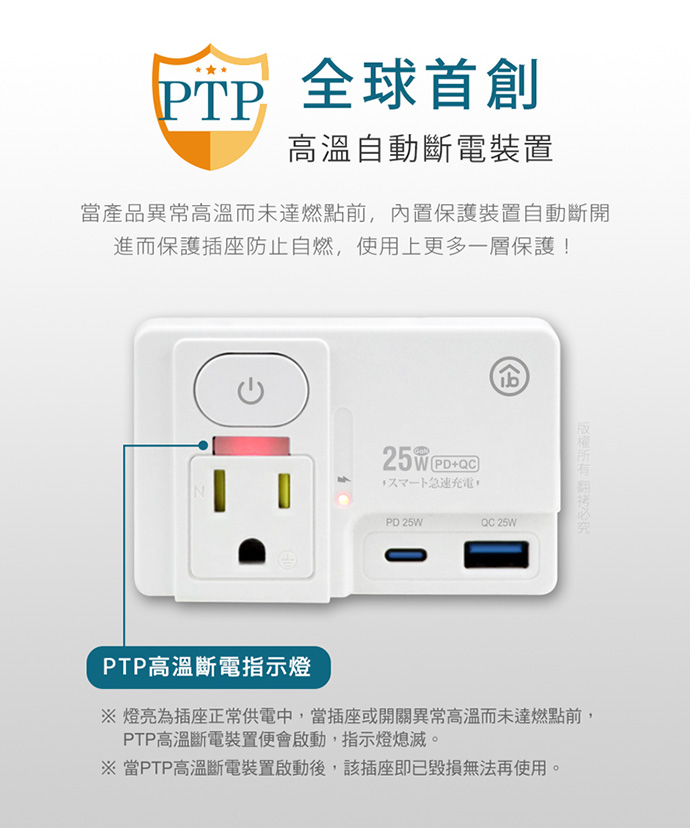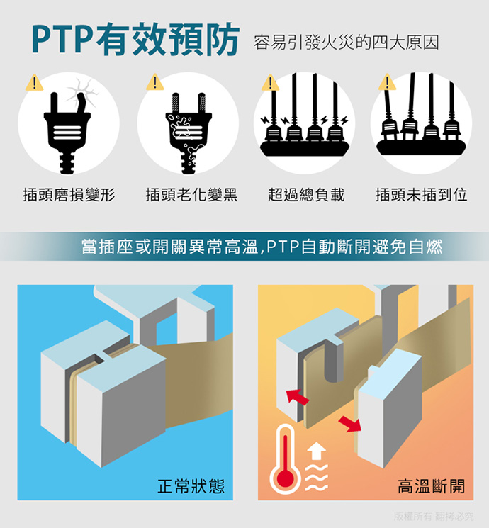 ◆全球首創PTP高溫斷電系統,當插座或開關異常高溫而未達燃點前,PTP裝置自動斷開