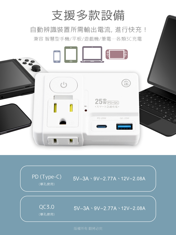 .QC輸出:DC 5V/3A;9V/2.77A;12V/2.08A (25W Max./單埠使用)