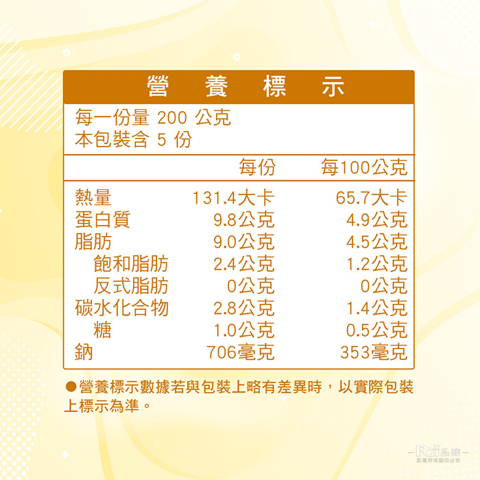 | 過敏原資訊 | 本產品含有大豆、含麩質之穀物、芝麻、魚類、堅果類、甲殼類及其製品,不適合其過敏體質者食用。 |
