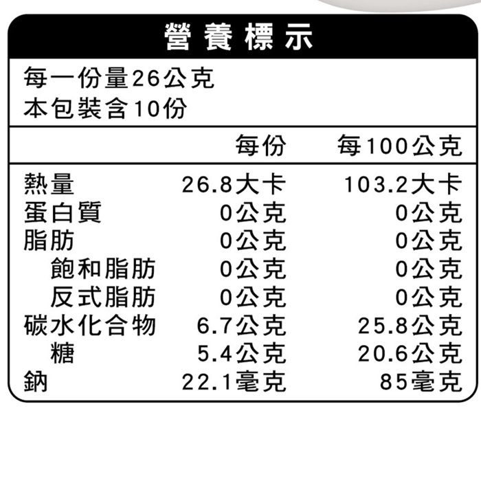 | 包裝內容/商品規格 | 26公克/顆,10顆/包,30包/箱 |
