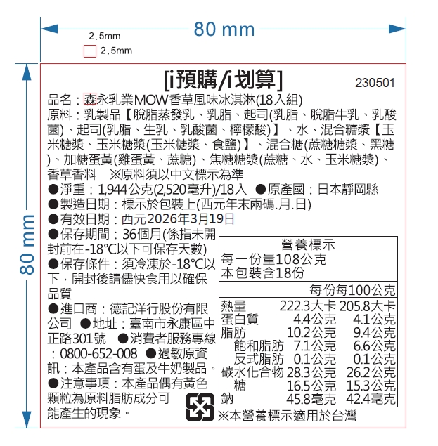 | 過敏原資訊 | 本產品含有蛋及牛奶製品。 |