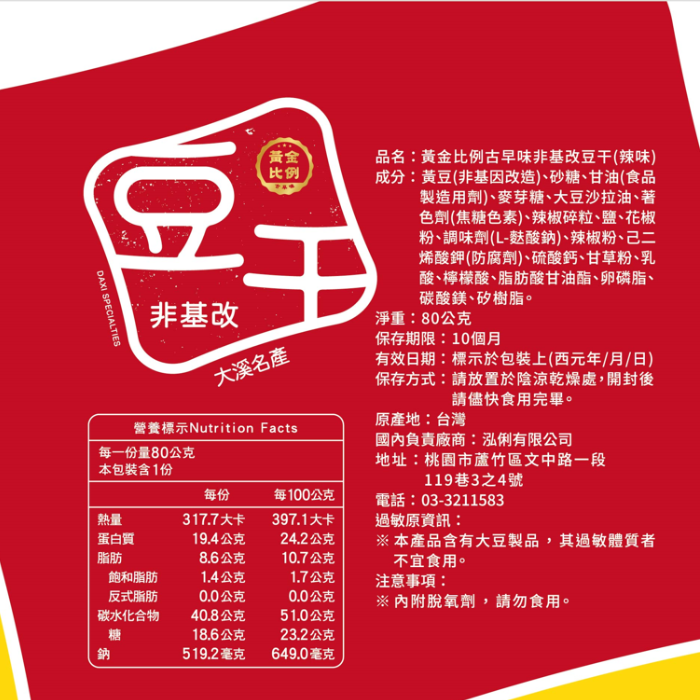 | 商品名稱 | 黃金比例古早味非基改豆干(辣味)-箱購 |