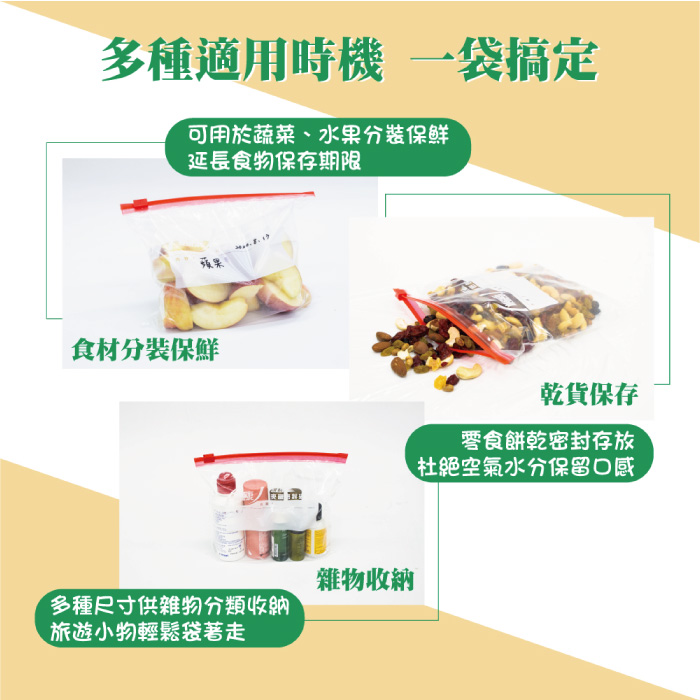 使用方法: 將商品置入袋中,滑軌密封即可 注意事項: