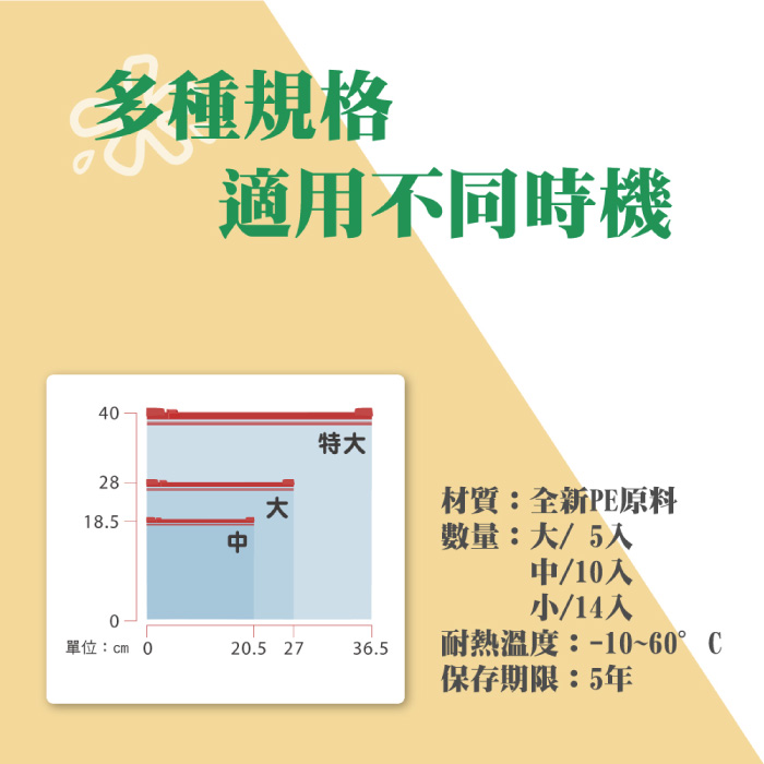 滑軌式夾鏈密封袋(特大) 40x36.5cm 滑軌式夾鏈密封袋(大) 28x27cm 滑軌式夾鏈密封袋(中) 18.5x20.5cm |