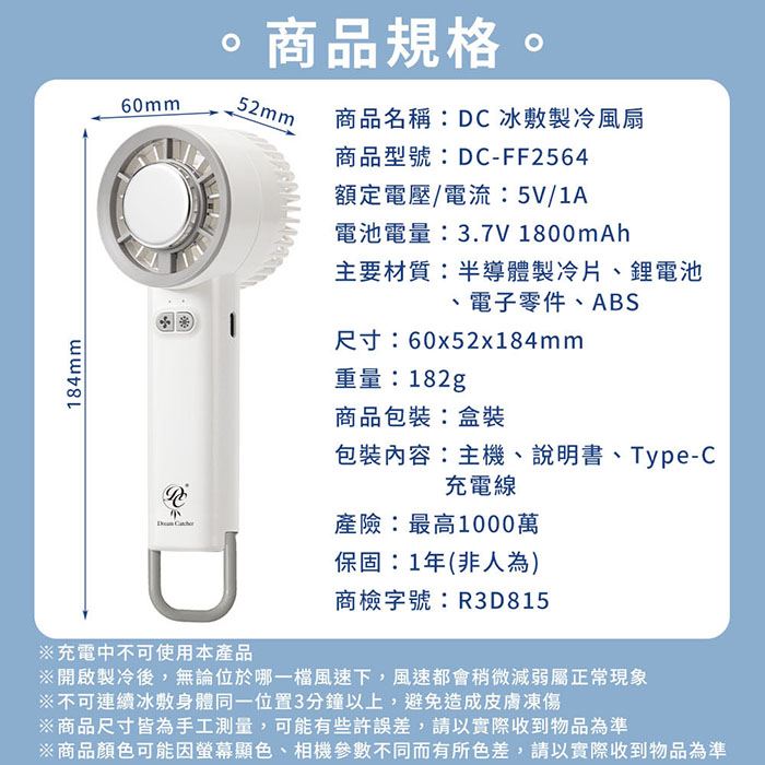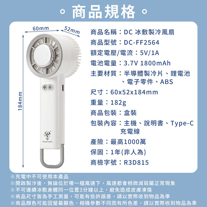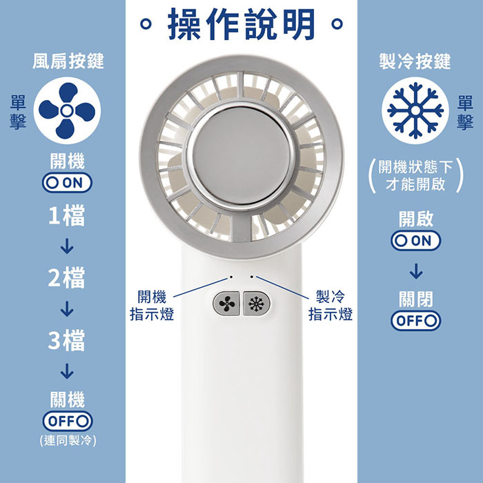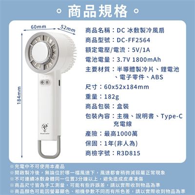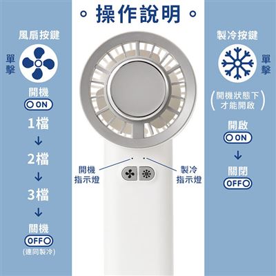 | 注意事項 | ※充電中不可使用本產品。 ※使用前請詳閱說明書,以免發生危險 ※請注意勿使用快充插頭,以避免無法過電情況發生。 ※請使用檢驗合格的充電器對本產品供電,避免發生意外 ※開啟製冷後,無論位於哪一檔風速下,風速都會稍微減弱屬正常現象。 ※不可連續冰敷身體同一位置3分鐘以上,避免造成皮膚凍傷。 ※請放置於陰涼乾燥、兒童無法觸及之處。 ※商品因環境光線、相機參數、螢幕顯色的不同,可能會有些許色差,請以實際收到商品為準。 ※產品尺寸為手工測量會有些許誤差,請以實際收到商品為準。 |