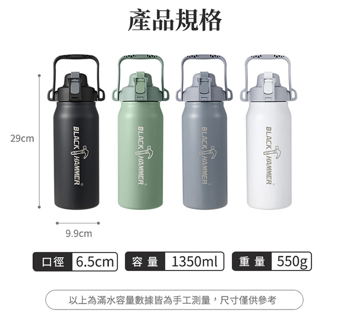 | 商品名稱 | 買一送一【BLACK HAMMER】探險者手提式316不鏽鋼雙飲口保冰保溫瓶1350ml(黑+白) |