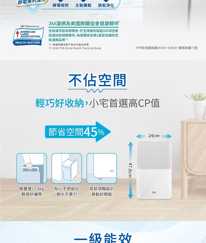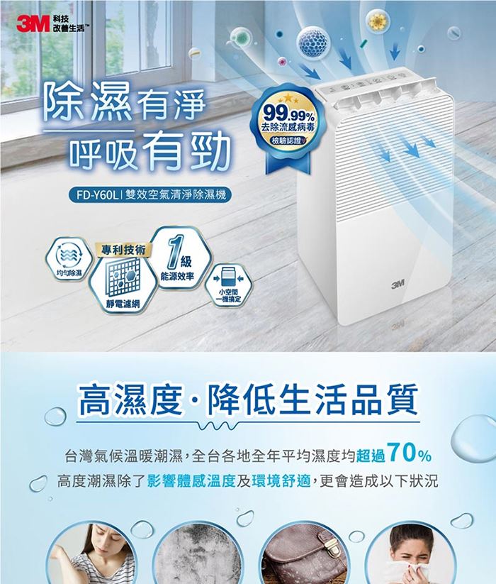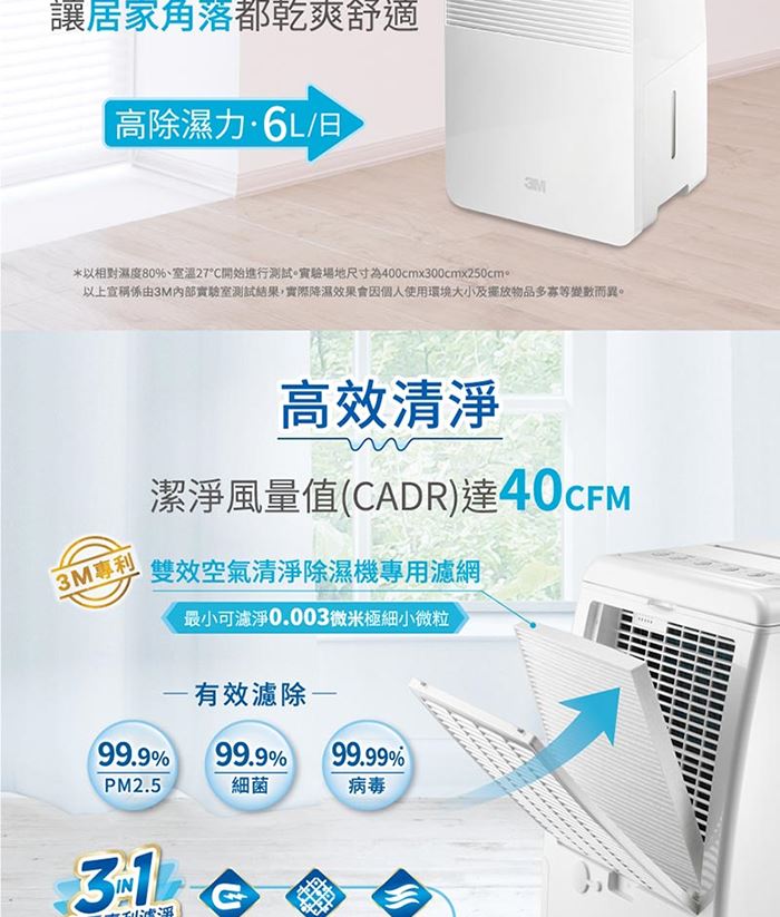 改善居家空氣品質,同步除濕加清淨,讓家裡不再因潮濕成為黴菌的溫床。3M FD-Y60L雙效空氣清淨除濕機,擁有禁得起以空氣清淨機標準檢視的濾淨力,潔淨風量值(CADR)高達40CFM(68CMH),適用最大3.3坪空間,租屋套房、儲藏室或衣帽間都非常適合。