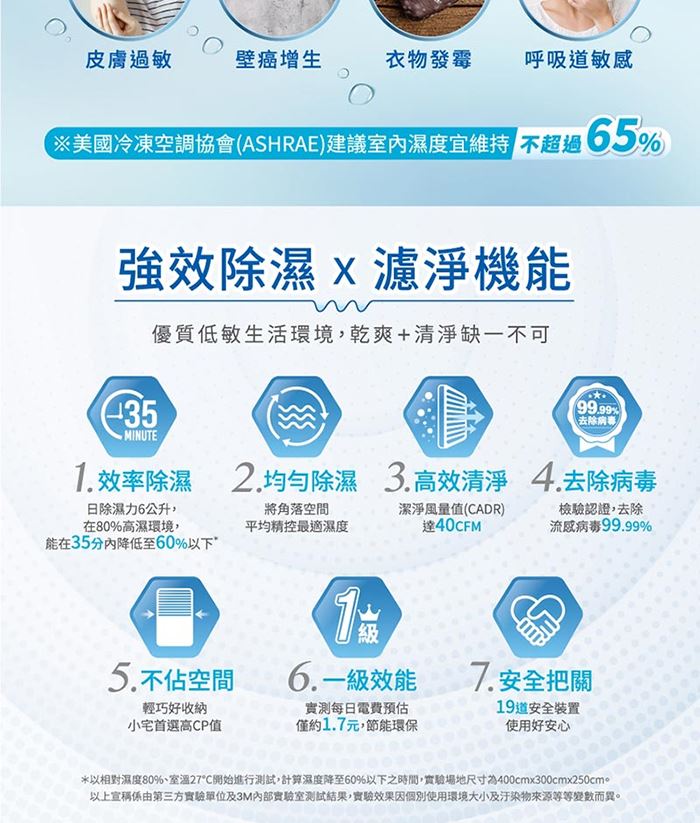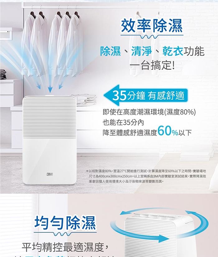 1.開啟後有效35分鐘降濕至60%,快速除濕,除濕、清淨、乾衣,一機搞定。
