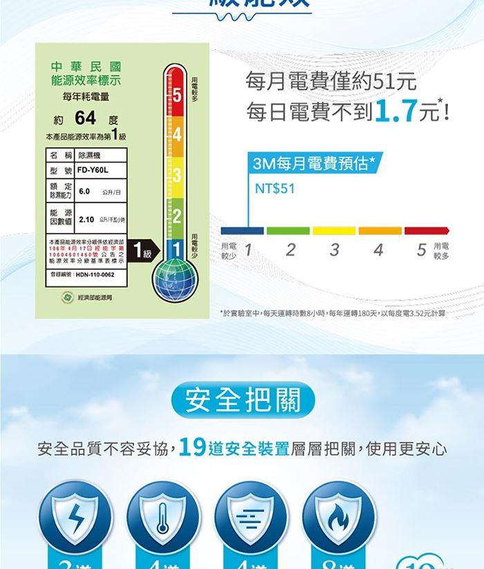 採用省電AC馬達及壓縮機,每日運轉時數8小時,每年運轉180天,以每度電3.52元估算,每月電費僅約51元,1天不到1.7元,也有19道安全裝置,安全無疑慮。