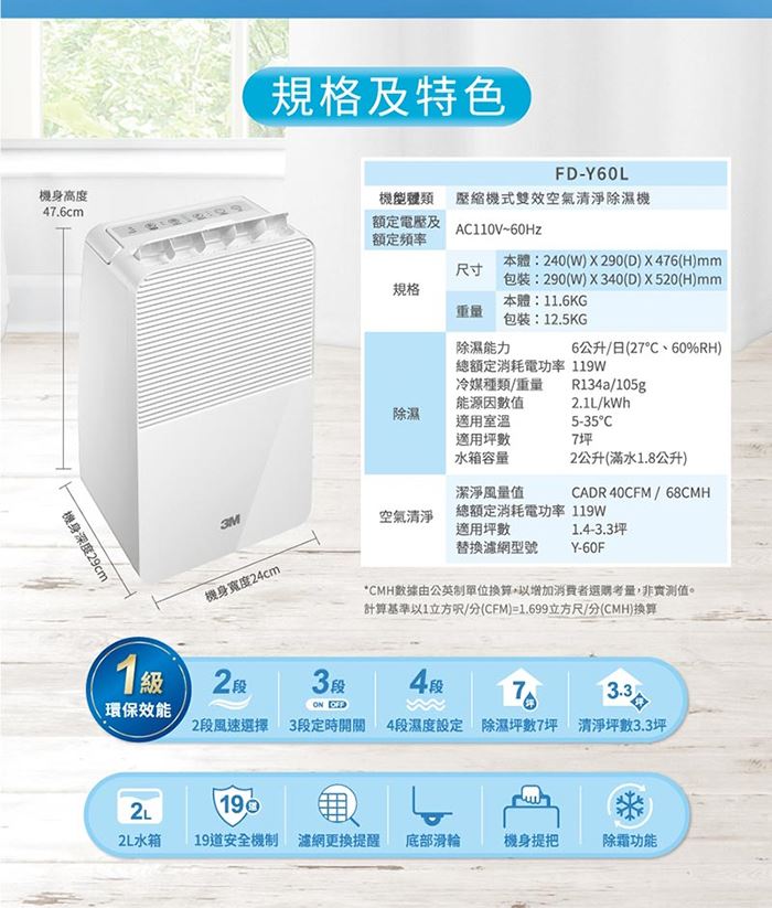 ◆FD-Y60L雙效清淨除濕機每日除濕力高達6公升,適用坪數7坪。
