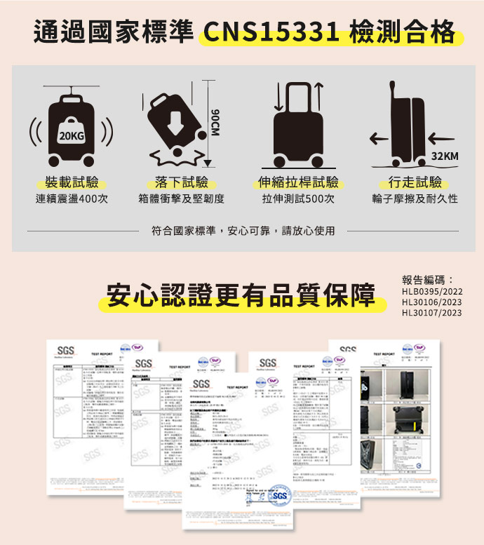 | 包裝內容/商品規格 | 箱體尺寸:38 X 35 X 70cm(不含輪) 箱體容量:約93公升 空箱重量:4.6kg 載重:20公斤 內袋:兩個 束帶:兩側皆含束帶 商品檢驗標識字號(BSMI):R3A400 |
