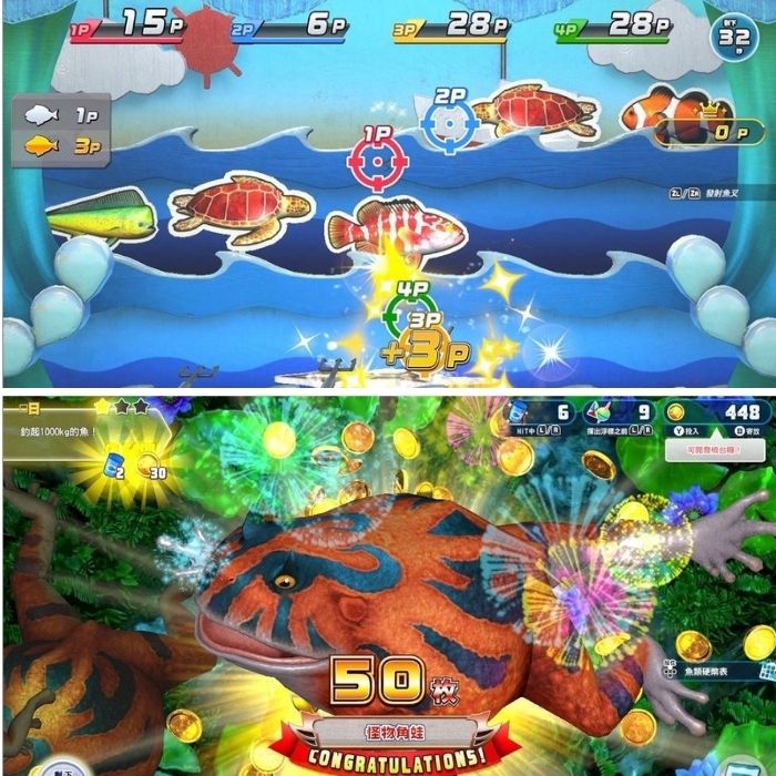 除了「打鱷魚」、「撈金魚」、「射魚叉比賽」等,總共 12 種水中生物們一齊登場的派對遊戲之外,更收錄了可互相競爭所釣到的魚的重量、金額等多種形式的釣魚大會。