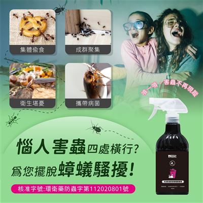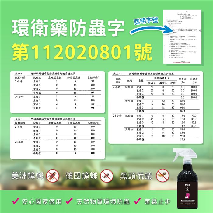 | 用途 | ˙適用範圍:一般場所之室內外環境。 ˙使用方法:噴灑於害蟲經常出沒的位置,如牆角、縫隙等處,噴灑於門窗、露營帳篷可防止害蟲接近。對蟑螂螞蟻避忌時間24小時有效。 |