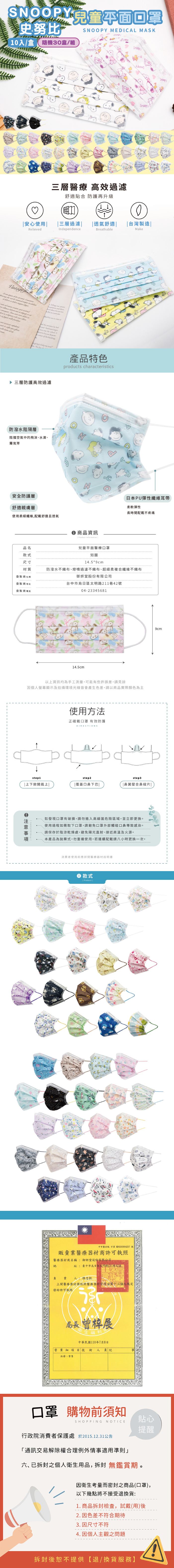 | 包裝內容/商品規格 | 史努比 平面口罩 / 兒童平面 14.5x9cm (±0.5cm) ;10入/盒 |