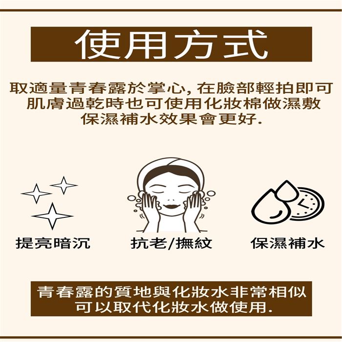 | 使用方法 | 青春露-化妝水使用、潔顏慕斯-洗面乳使用 |