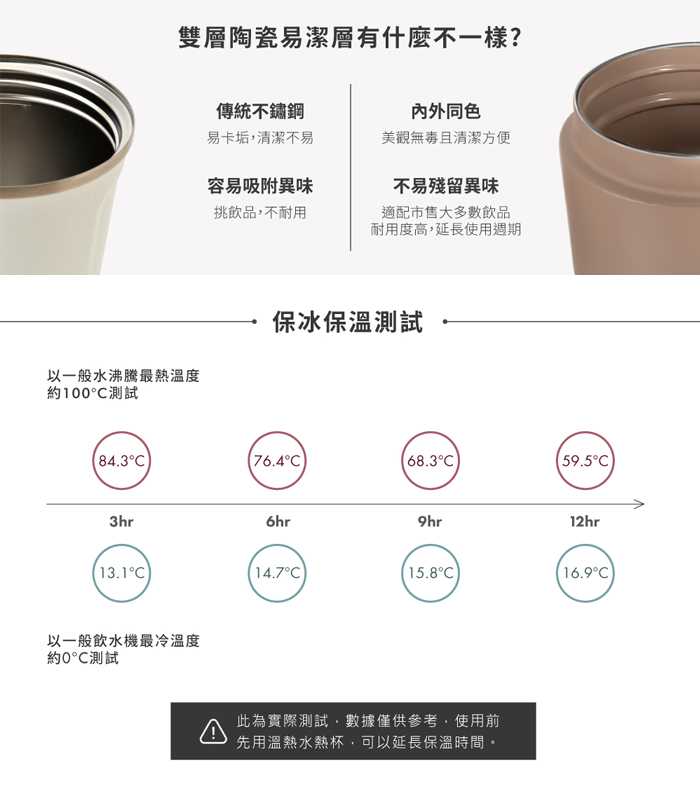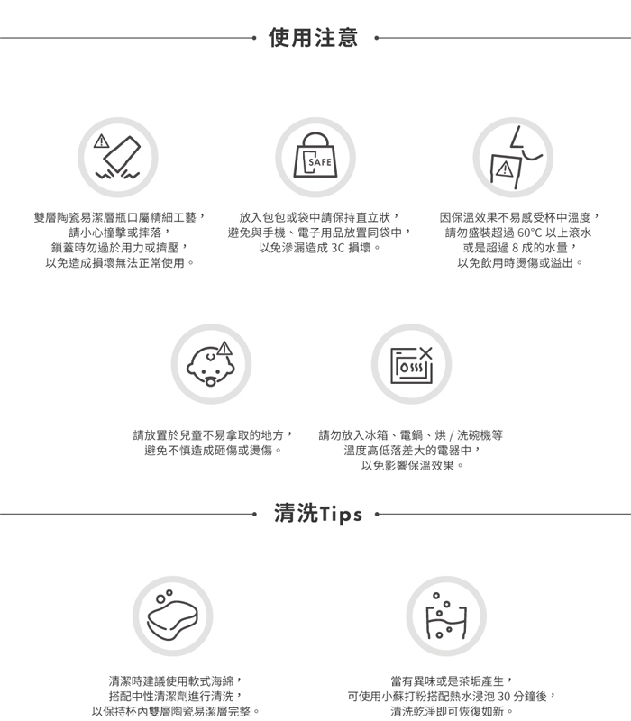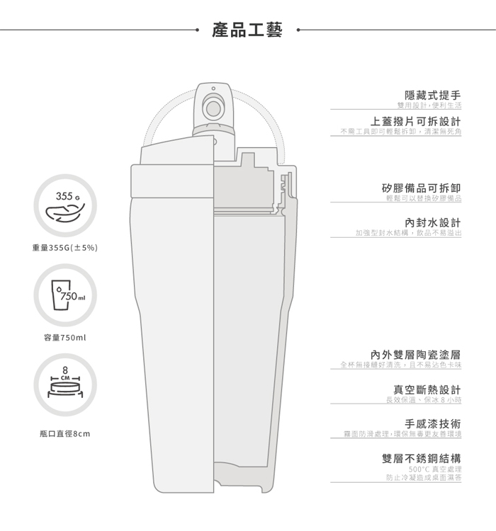瓶身內膽-304不銹鋼、雙層陶瓷塗層,瓶身外層-304不銹鋼,上蓋-PP+矽膠(食品級耐熱190°C),密封圈-矽膠(食品級耐熱190°C)