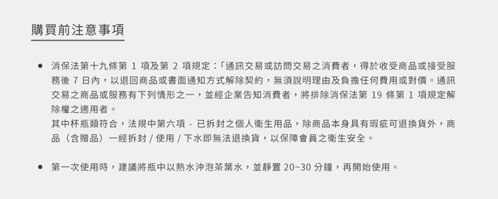 注意事項 消保法第十九條第1項及第2項規定 : 「通訊交易或訪問交易之消費者,得於收受商品或接受服務後7日內,以退回商品或書面通知方式解除契約,無須說明理由及負擔或對價。通訊交易之商品或服務有下列情形之一,並經企業告知消費者,將排除消保法第19條第一項規定解除權之適用者。