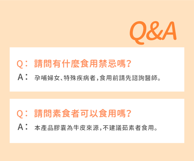 | 注意事項 | 1.本產品含有甲殼類製品,不適合對其過敏體質者食用。 2.有服用慢性病藥物者,應諮詢醫師後,方可使用。 3.不建議孕婦、授乳者及嬰幼兒食用。 |
