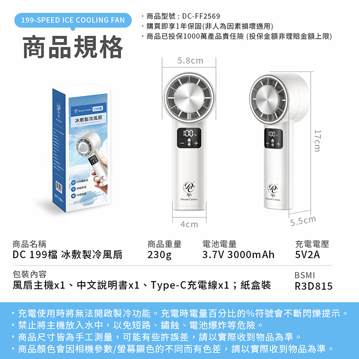 | 注意事項 | ※充電使用時將無法開啟製冷功能。充電時電量百分比的%符號會不斷閃爍提示。 ※禁止將主機放入水中,以免短路、鏽蝕、電池爆炸等危險。 ※使用前請詳閱說明書,以免發生危險 ※請注意勿使用快充插頭,以避免無法過電情況發生。 ※請使用檢驗合格的充電器對本產品供電,避免發生意外 ※開啟製冷後,無論位於哪一檔風速下,風速都會稍微減弱屬正常現象。 ※不可連續冰敷身體同一位置3分鐘以上,避免造成皮膚凍傷。 ※請放置於陰涼乾燥、兒童無法觸及之處。 ※商品因環境光線、相機參數、螢幕顯色的不同,可能會有些許色差,請以實際收到商品為準。 ※產品尺寸為手工測量會有些許誤差,請以實際收到商品為準。 |