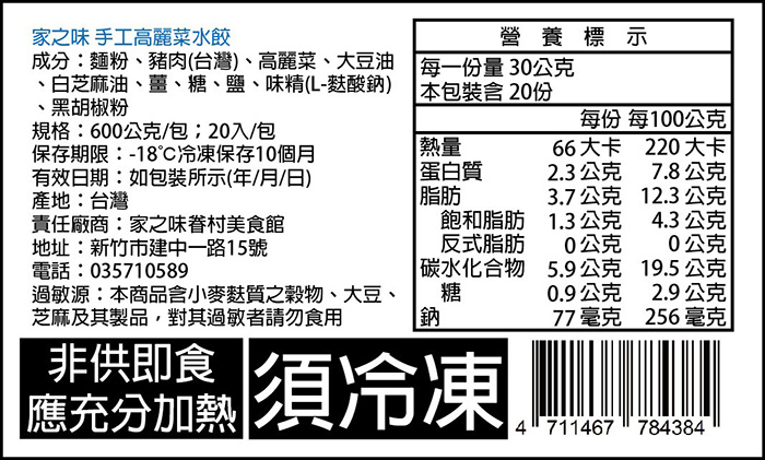 | 商品名稱 | 【家之味眷村美食】手工高麗菜水餃20包(20入/包) |