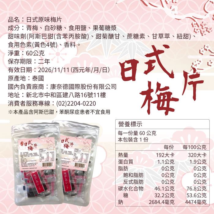 本產品含阿斯巴甜,苯酮尿症 患者不宜食用 |