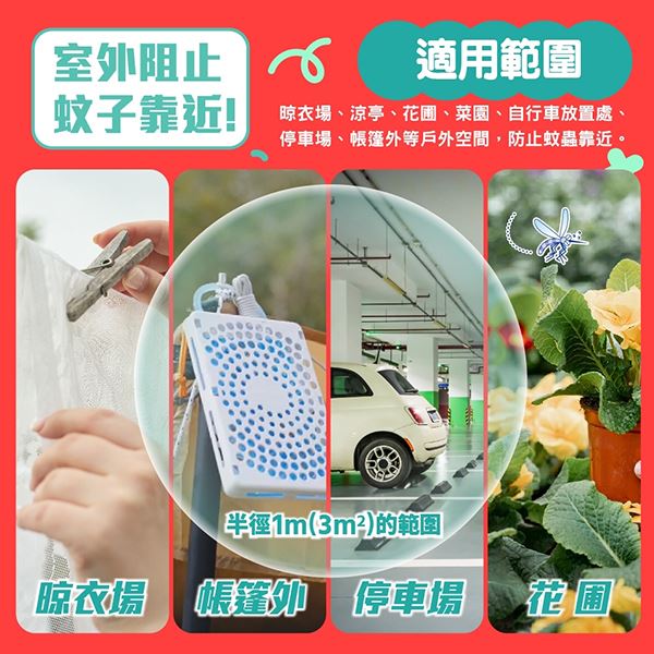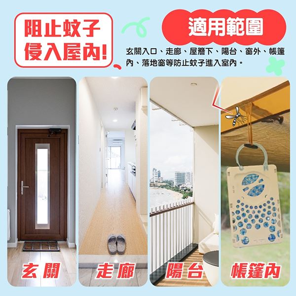 2.拆開紙質包裝外盒,取出本品,直接懸掛/放置於蚊子或小黑蚊出沒處,如玄關入口、走廊、屋簷下、陽台、窗外、帳棚內、落地窗等防止蚊子進入室內;或者花圃、自行車放置處、晾曬衣物處、帳棚外等戶外空間,防止蚊蟲靠近。