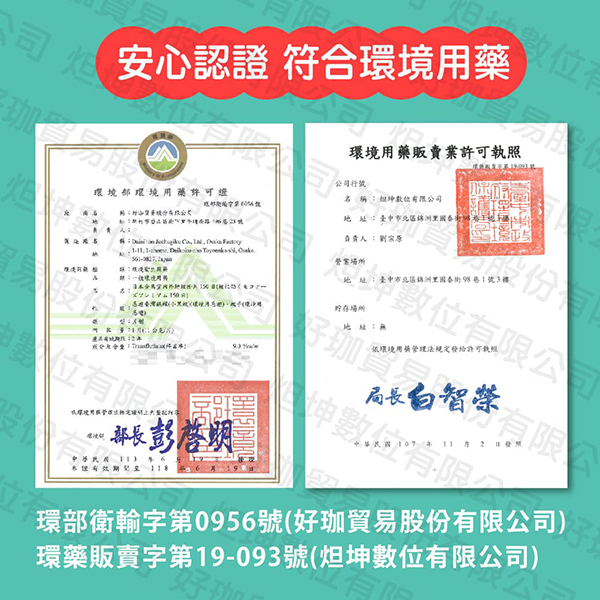 2.合法環境用藥應有環境用藥許可證字號,可至環保署化學局「環境用藥許可證及病媒防治業網路查詢系統」(https://mdc.epa.gov.tw/PublicInfo/)查詢。