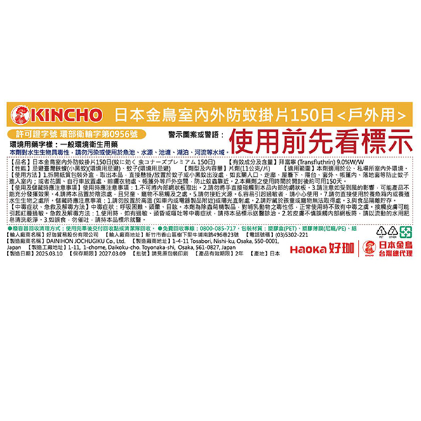 | 內容物 | 日本金鳥室內外防蚊掛片150日戶外用 |
