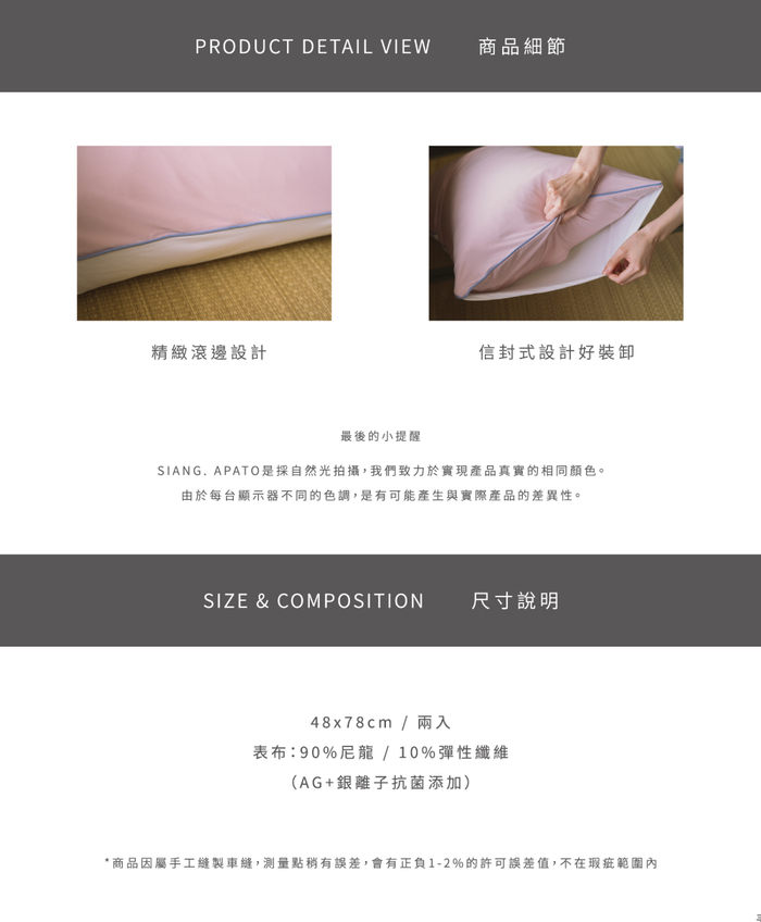 | 成分 | 表布: 90% Nylon + 10% Spandex(Ag+銀離子抗菌添加) 填充: 100% Polyester 超細纖維 |