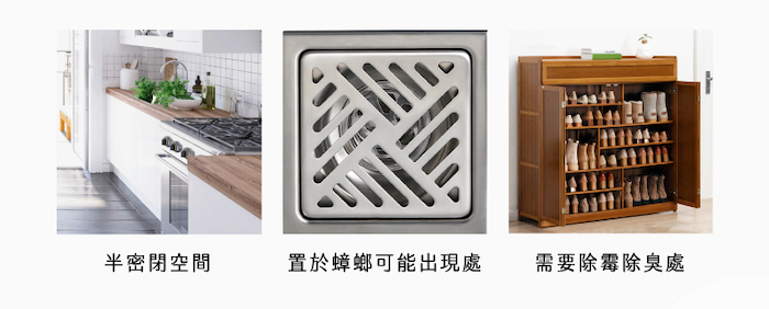 可直接放置於儲藏間、和式地板下、牆壁隔間內,約每一坪四顆的用量,於排水孔邊、餐桌下、寵物居所等