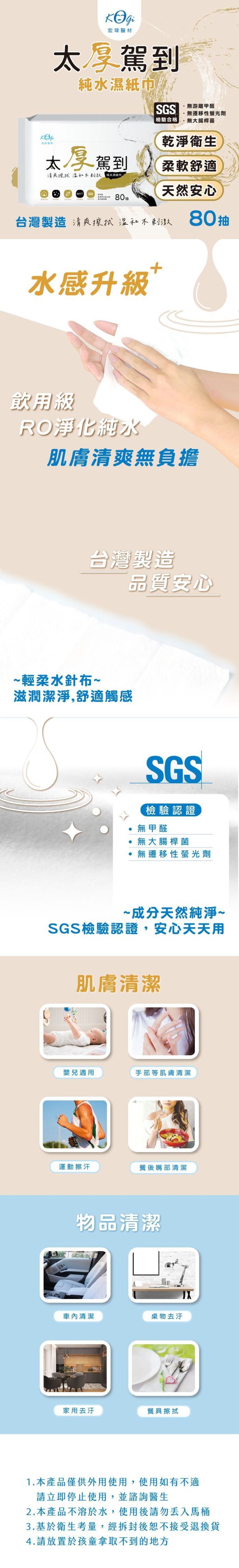 | 注意事項 | 請置於嬰幼兒無法取得處 ◾請勿讓嬰兒放入口中咀嚼,以免誤吞濕紙巾 ◾請勿使用在傷口、紅腫或濕疹等部位 ◾皮膚敏感者建議先做局部皮膚測試,若有過敏反應,請立即就醫,並停止使用 ◾本濕紙巾不溶於水,請勿丟入馬桶內品名:太厚駕到-柔膚迷你純水濕紙巾-多彩款8包 |