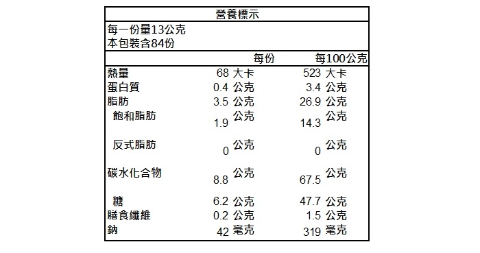 | 過敏原資訊 | 本產品含有牛奶.麩質穀物.雞蛋.大豆.堅果類及其製品,不適合對其過敏體質者食用。 |