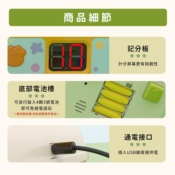| 成分 | 塑膠及電子元件 【適用年齡】 3歲以上 【供電模式】 裝入4顆3號電池即可使用(需自備);亦可插著USB線遊玩。 |