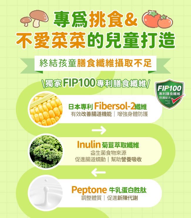 | 內容物 (完整成份/食品添加物) | 難消化性麥芽糊精(Fibersol-2)、菊糖(Inulin)、牛乳蛋白(Peptone) | |