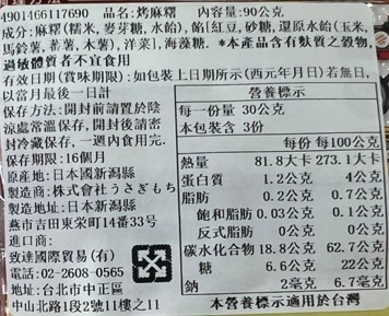 | 營養標示 | 如包裝所示,本營養標示適用於台灣 |