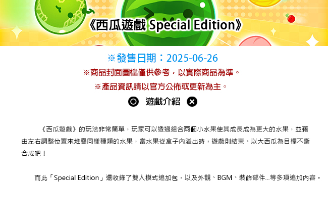 | 商品名稱 | NS 西瓜遊戲 Special Edition 中文版 |