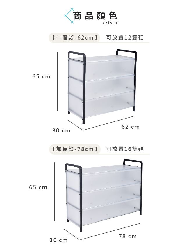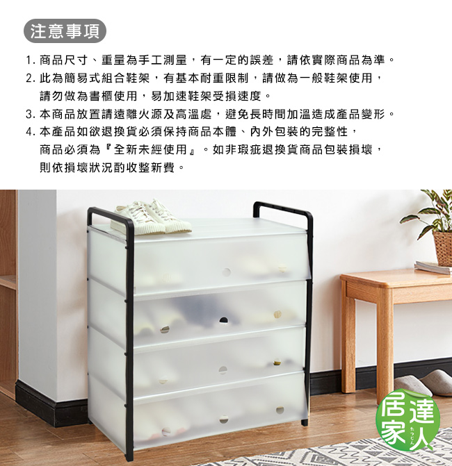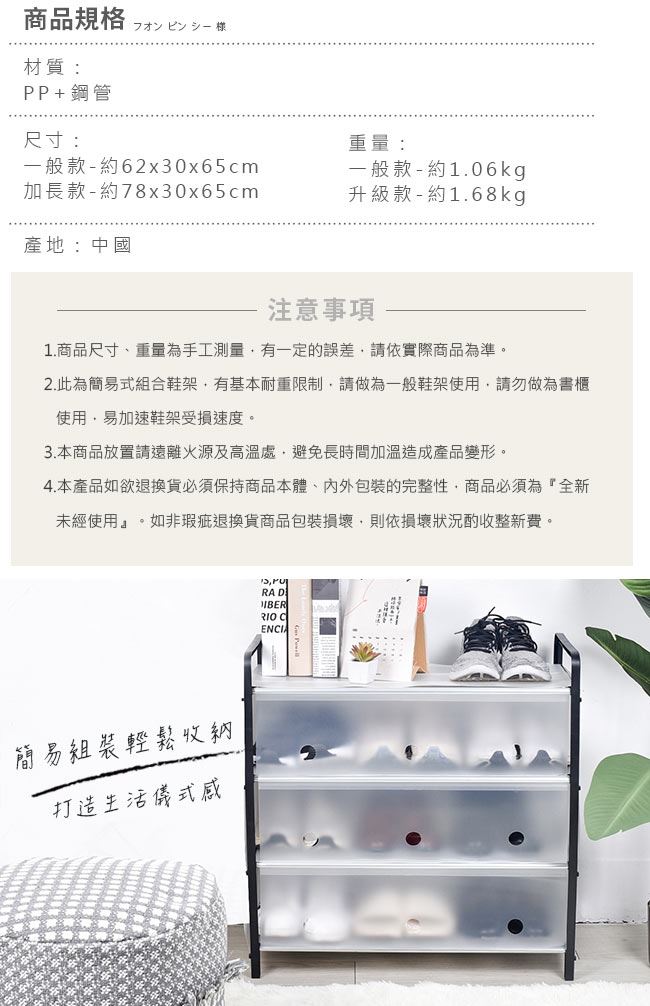 | 注意事項 | 1.商品尺寸、重量為手工測量,有一定的誤差,請依實際商品為準。 2.此為簡易式組合鞋架,有基本耐重限制,請做為一般鞋架使用,請勿做為書櫃使用,易加速鞋架受損速度。 3.本商品放置請遠離火源及高溫處,避免長時間加溫造成產品變形。 |