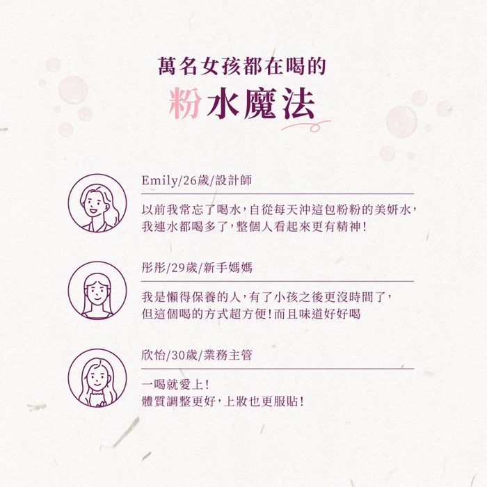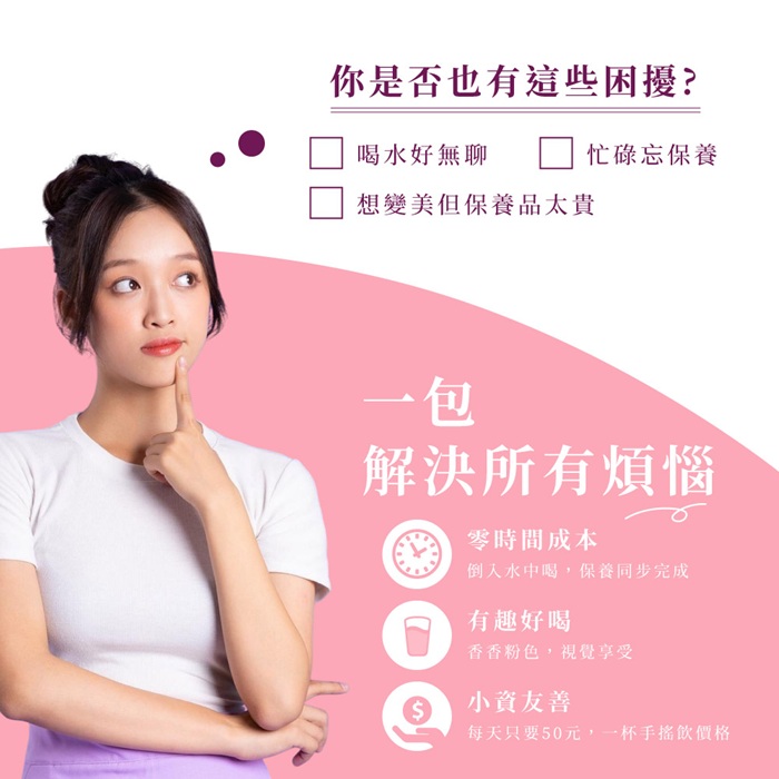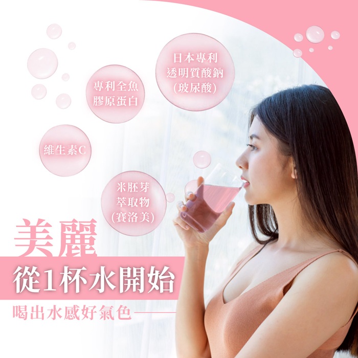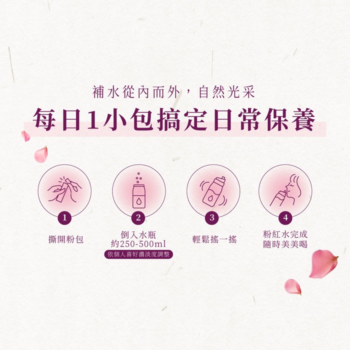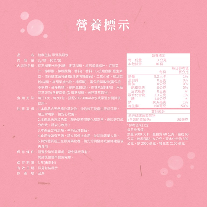 紅石榴果汁粉(砂糖、麥芽糊精、紅石榴濃縮汁、紅甜菜汁、檸檬酸、檸檬酸鈉、香料)、香料、 L 抗壞血酸(維生素 C)、 流行鏈球菌發酵物(含透明質酸鈉)、 二氧化矽 、 紅甜菜粉(糊精、紅甜菜抽出物、檸檬酸)、雷公根萃取物(雷公根萃取物、麥芽糊精)、 膠原蛋白(魚)、 蔗糖素(甜味劑)、 米胚芽萃取物(含賽洛美)(β-環狀糊精、米胚芽萃取物) 食用方式:每日 1 次,每次 1 包, 搭配 250-500m l 冷水或常溫水攪拌後飲用 。 |