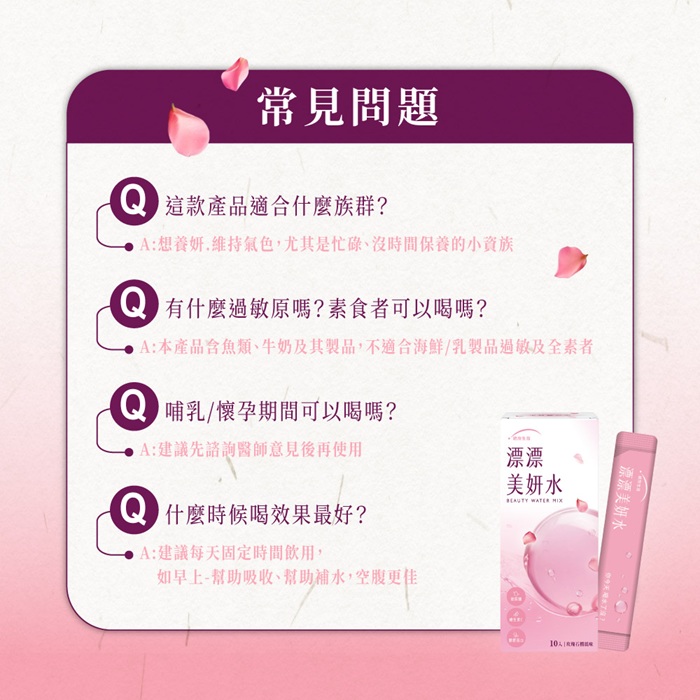 | 注意事項 | 1.本產品含天然植物萃取物,沖泡後可能產生天然沉澱,屬正常現象,請安心飲用 。 2.本產品未添加色素,顏色隨時間變化屬正常,係因天然成分所致,請安心飲用。 3.本產品含有魚類 、牛奶及其製品。 4.食用後如有不適,請立即停止食用,並洽詢專業人員。 5.特殊體質或正在服用藥物者,請先洽詢醫師或藥師建議後再食用。 |