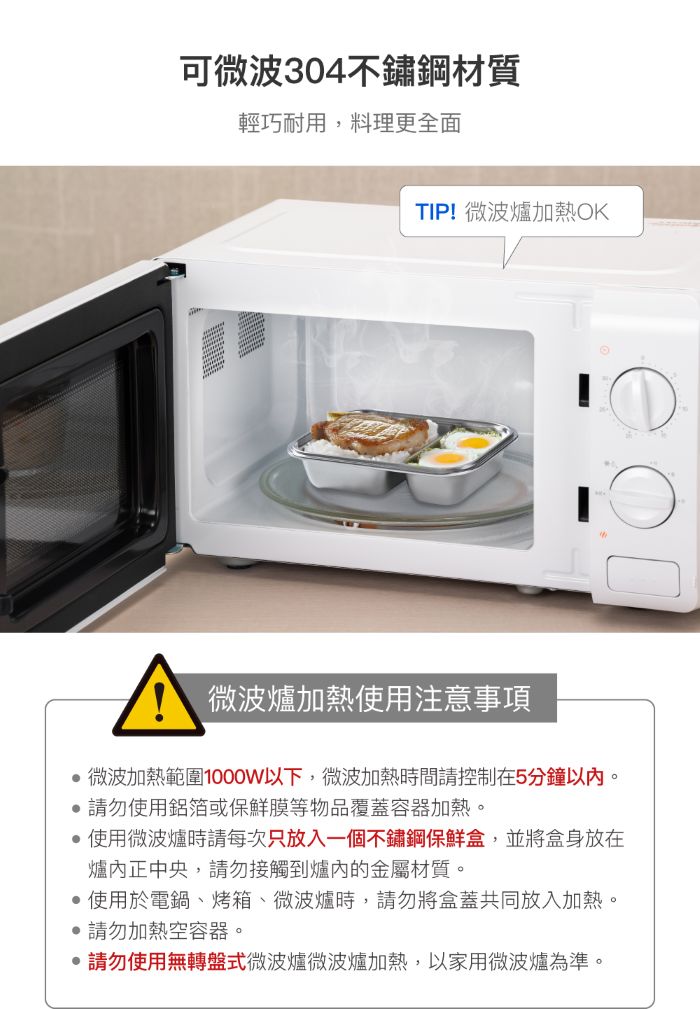 1.使用於電鍋(需加蒸架)時,請勿將盒蓋共同放入加熱。 2.請勿用火直接加熱。 3.冷凍保管時,含豐富水份之固體食物或液體請勿裝滿容器。 4.請勿於未盛裝食物時加熱。 5.上蓋遇熱變形係屬正常現象,請安心使用。 6.請勿加熱空容器。 7.請勿直接注入滾燙熱水以免造成燙傷,或立即將上蓋扣上會因熱蒸氣壓力上升而造成滲漏。 8.首次使用前請先使用少量醋清洗產品,並勿用粗硬材質之清潔刷清洗,以避免表面產生刮痕。 9.請勿使用保鮮膜包裝,以免造成產品沾黏。 10.微波加熱範圍1000W請控制在5分鐘以內。 11. 請勿使用鋁箔或保鮮膜等物品覆蓋容器加熱。 12. 使用微波爐時請每次只放入一個不鏽鋼保鮮盒,並將盒身放在爐內正中央,請勿接觸到爐內的金屬材質。 13. 請勿使用無轉盤式微波爐加熱。放入微波爐使用前,請先確認產品沒有凹陷變形。 |